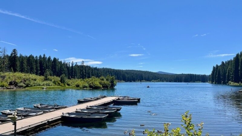 For those looking for an easy summer hike in the Cascades, it is hard to beat Clear Lake. Better known as a great hike for fall color, it can be enjoyable to spend a few hours hiking the five plus mile loop around Clear Lake in the summer. It is during the warm summer months that many families drive to Clear Lake to enjoy the beautiful water with their rowboat, kayak, paddle board or other floating device; motorized vehicles are not permitted on the lake. While hiking the easy path, it can be fun to watch the young families fishing or paddling around the lake and enjoying the food at the resort. There are year-round cabin rentals available as well as camping. Run by the Linn County Parks & Recreation, the resort is located in the Willamette National Forest and the lake contains the headwaters of the McKenzie River via a percolating spring at the far end of the lake. The lake was formed 3000 years ago when lava from Sand Mountain backed up the river forming the lake. The remnants of the flooded forest are still visible 120 feet underwater and have not fully rotted in all the centuries due to the extreme chill of the lake.